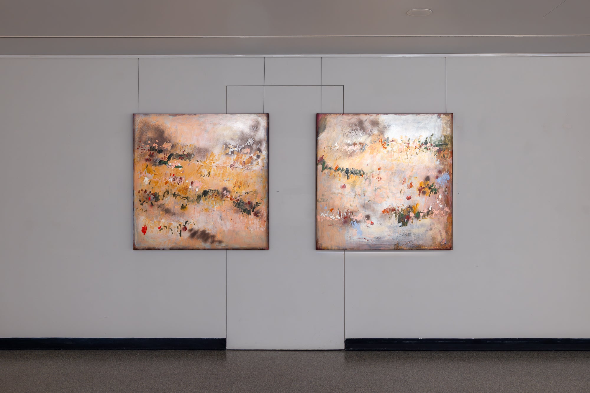 Her paintings return to ideas of connection, healing, and shared humanity. She begins with the body and allows colour, gesture, and texture to lead toward something universal. Layers of paint, stitched threads, bandages, and fragments of text echo the processes of mending and transformation. Ultrasound textures and the idea of palimpsest appear throughout her work, underscoring her interest in surfaces where earlier marks remain as quiet traces of a lived history.